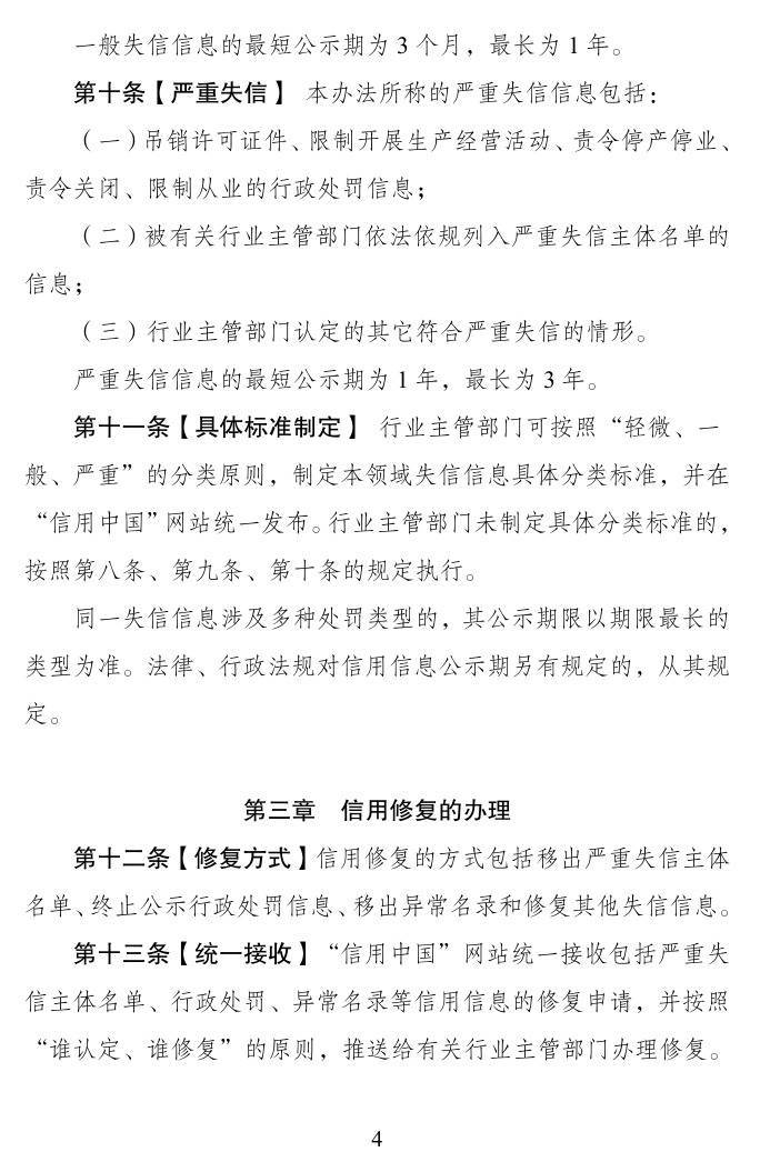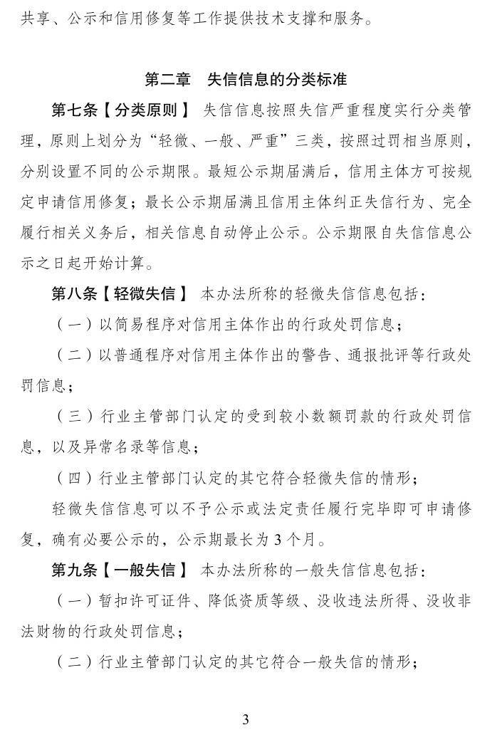 失信信息按照失信严重程度实行分类管理,原则上划分为“轻微、一般、严重”三类,按照过罚相当原则,分别设置不同的公示期限。